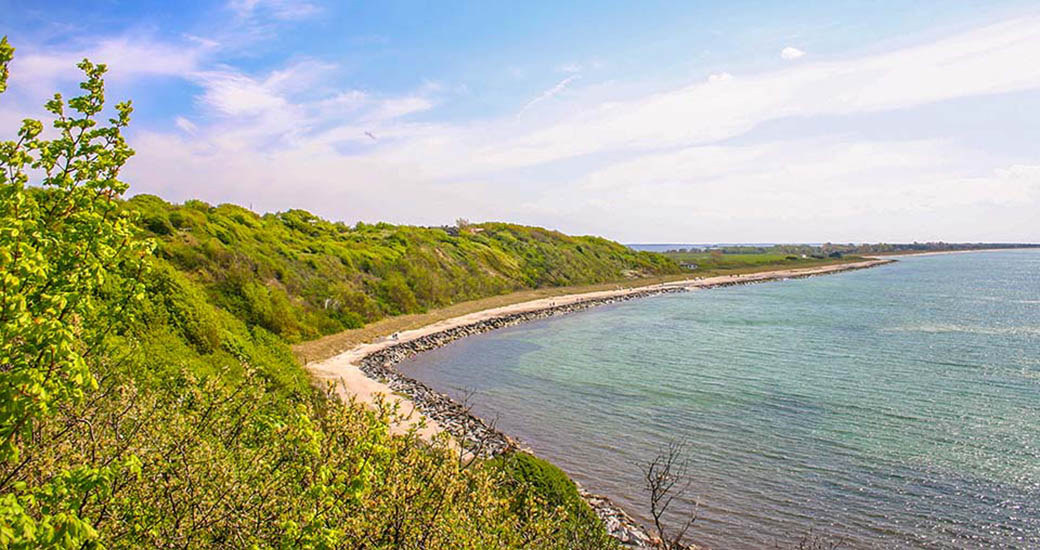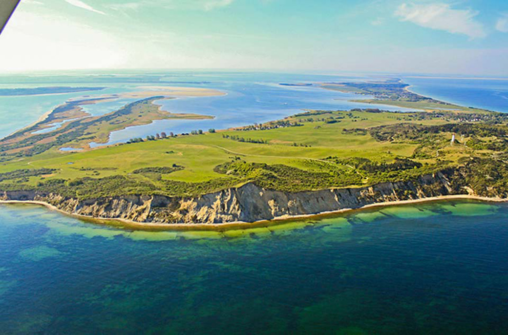 Blick vom Dornbusch auf den Ostsee-Strand der Von See: Steilufer des Dornbusches mit dem Leuchtturm auf der Insel Hiddensee.
