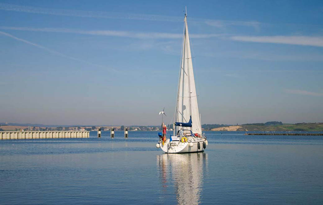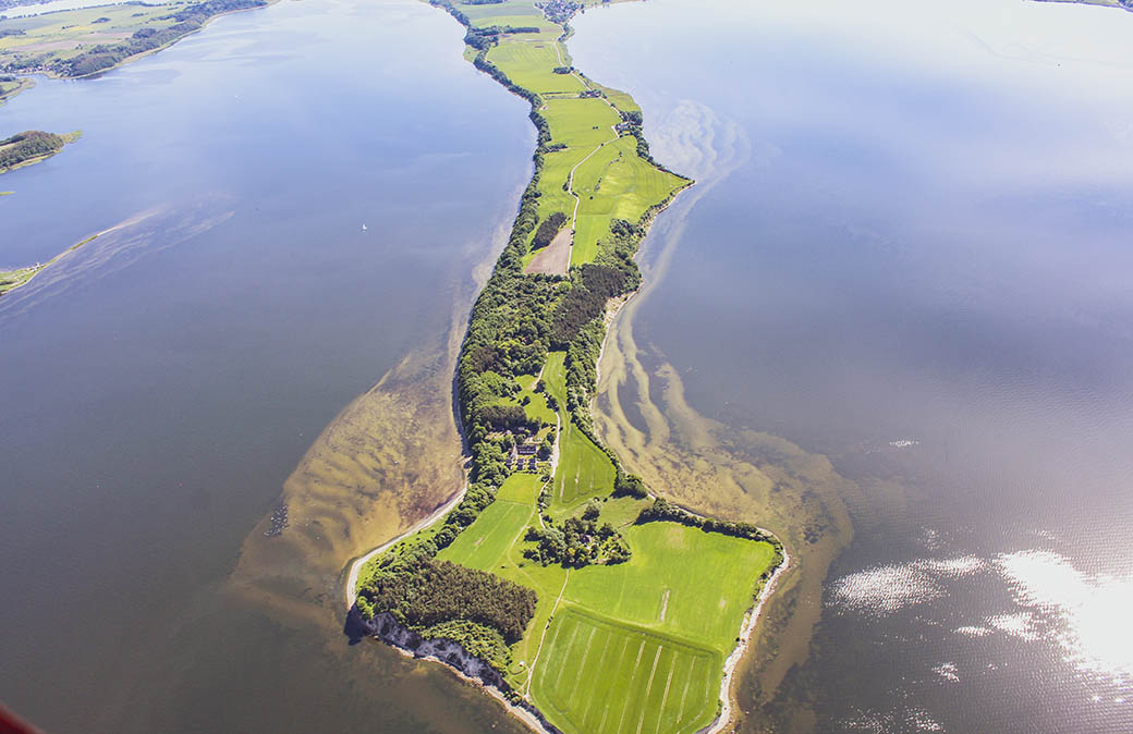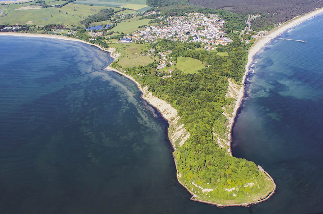 Luftaufnahme vom Nordperd mit dem vorgelagerten Bollwerk bis hin zum Ostseebad Göhren.